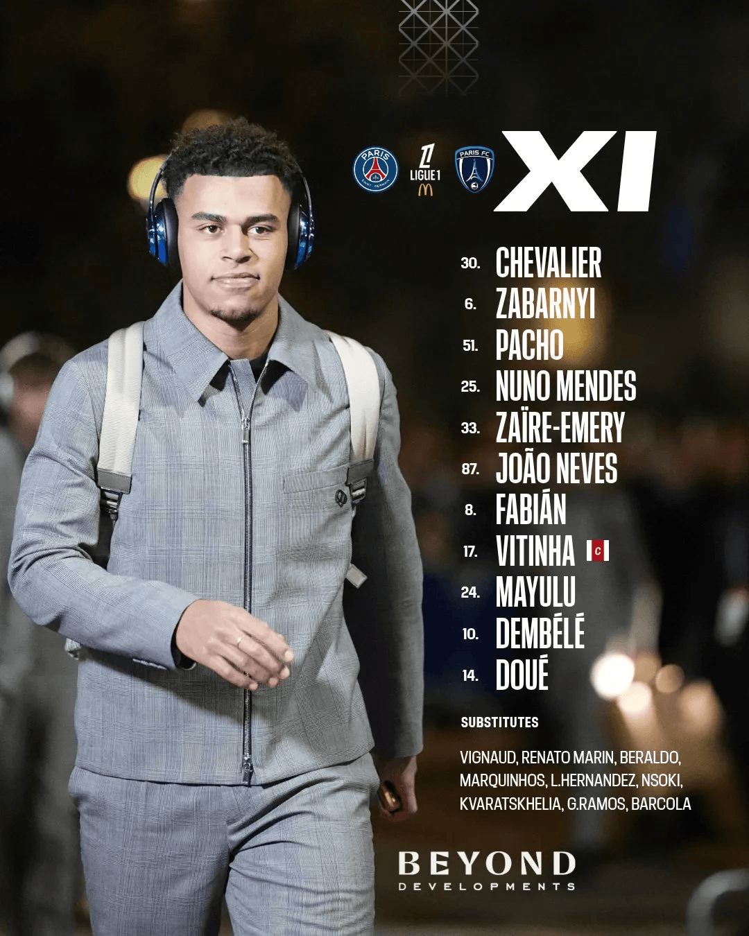 巴黎圣日耳曼首发:30-舍瓦利耶、6-扎巴尔尼、51-帕乔、25-努诺-门德斯、33-扎伊尔-埃梅里、87-若昂-内维斯、8-法比安-鲁伊斯、17-维蒂尼亚、24-马尤卢、10-乌斯曼-登贝莱、14-杜埃