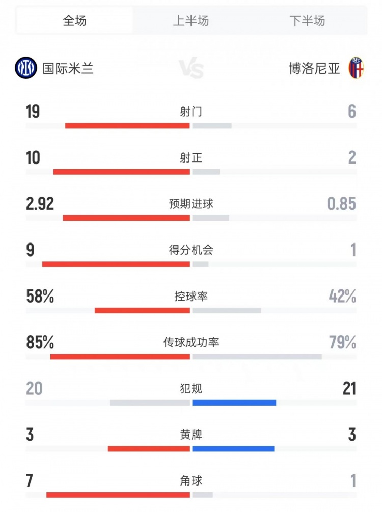 国米vs博洛尼亚全场数据: