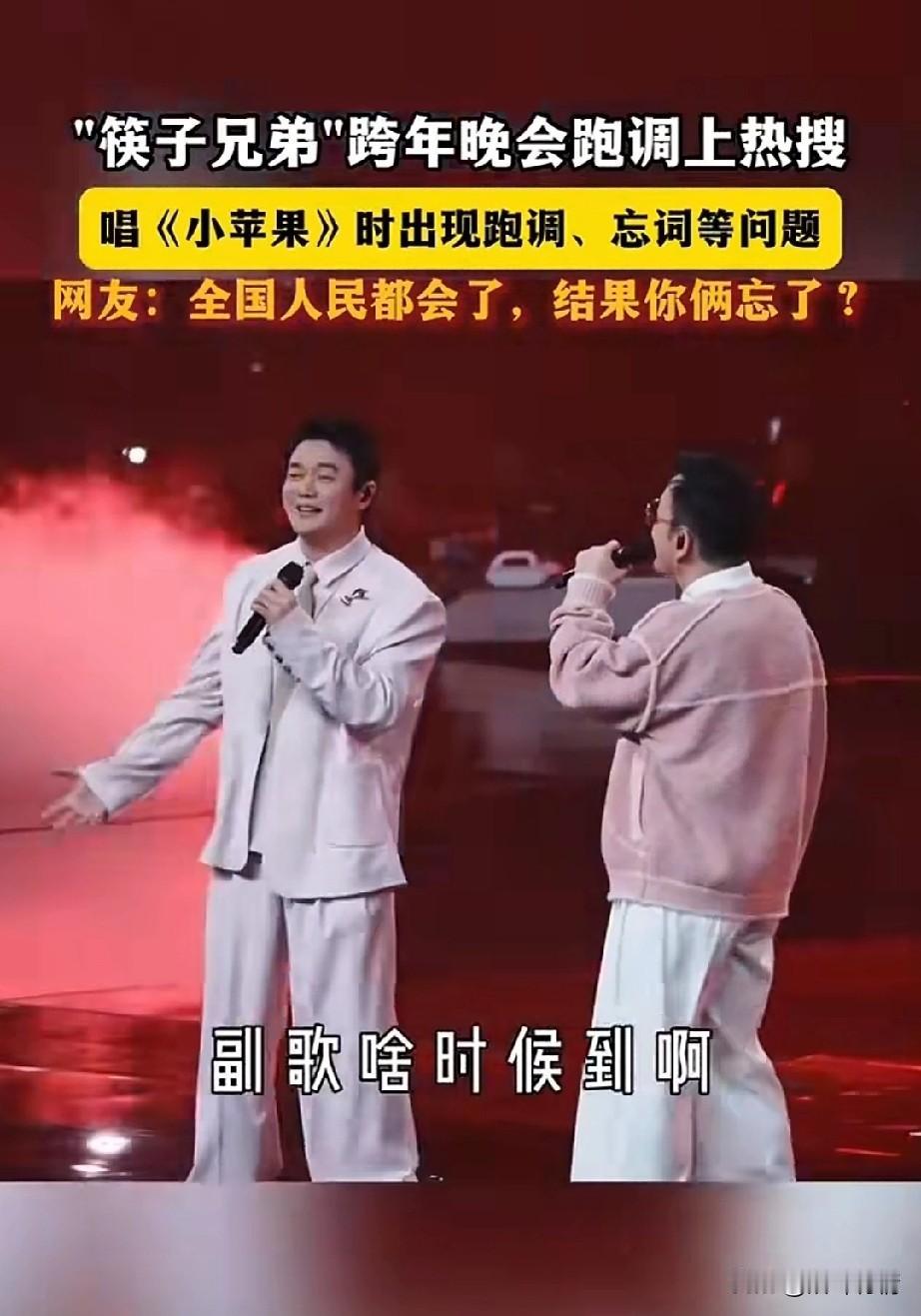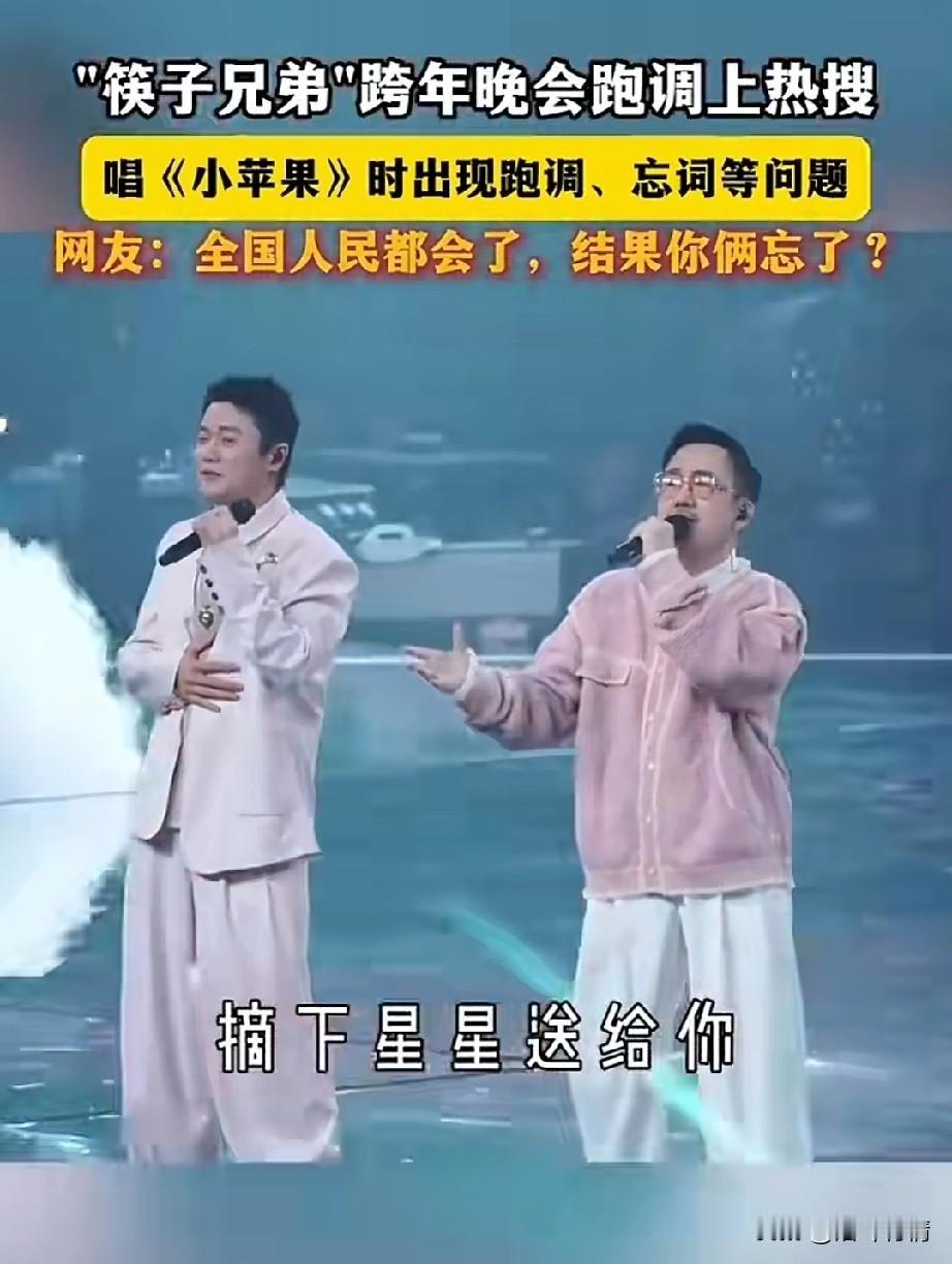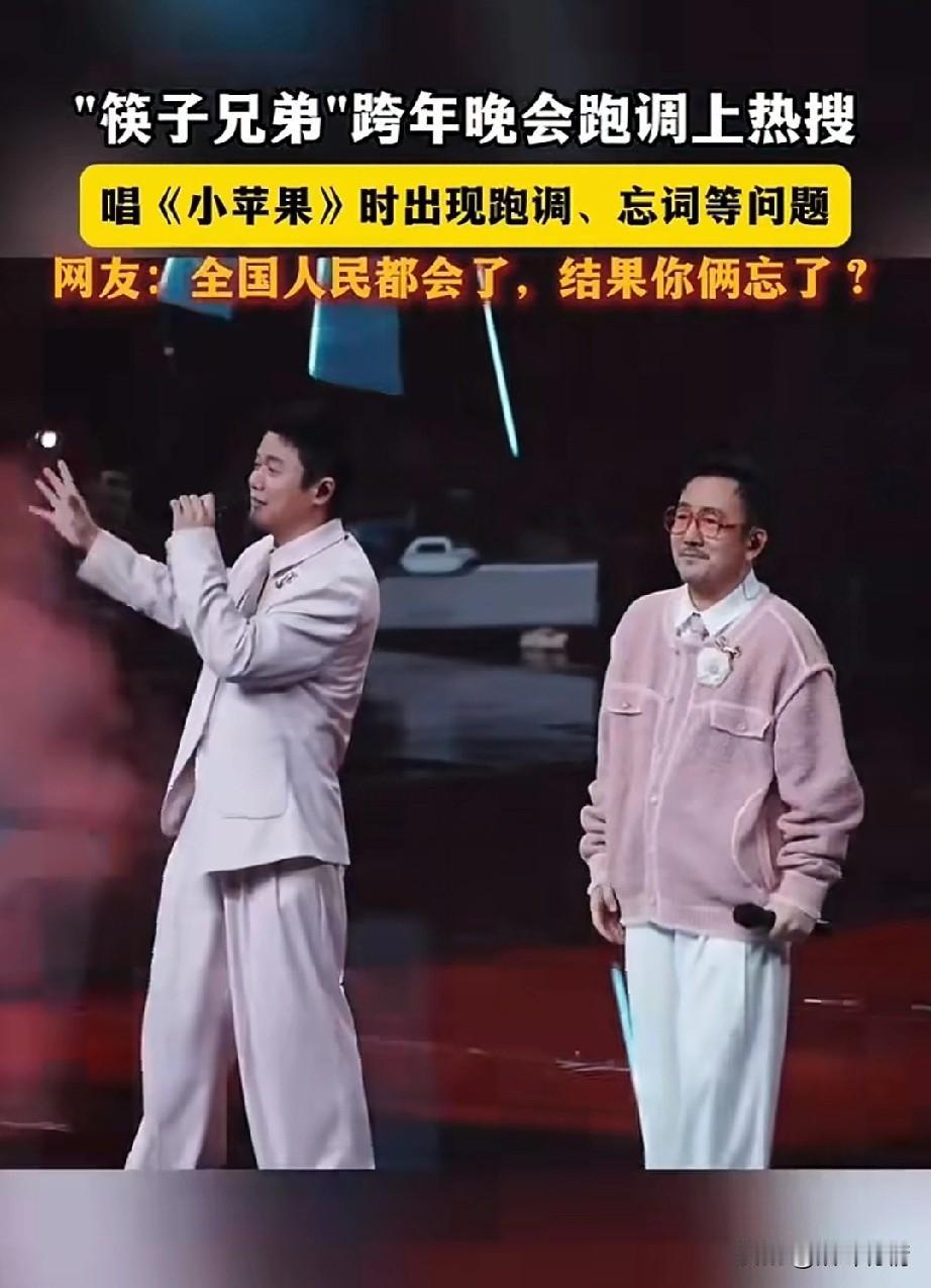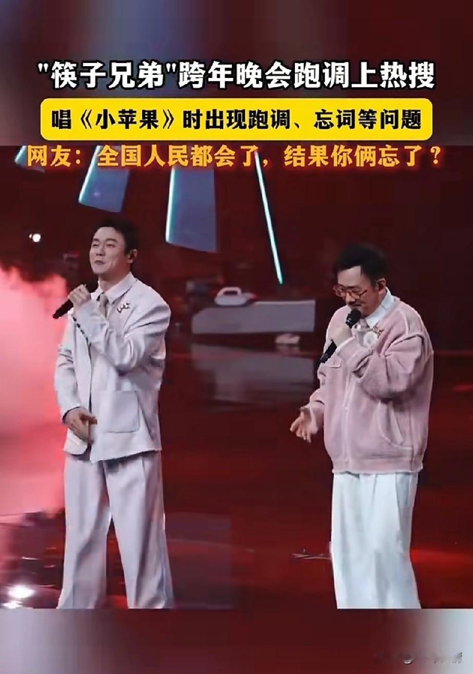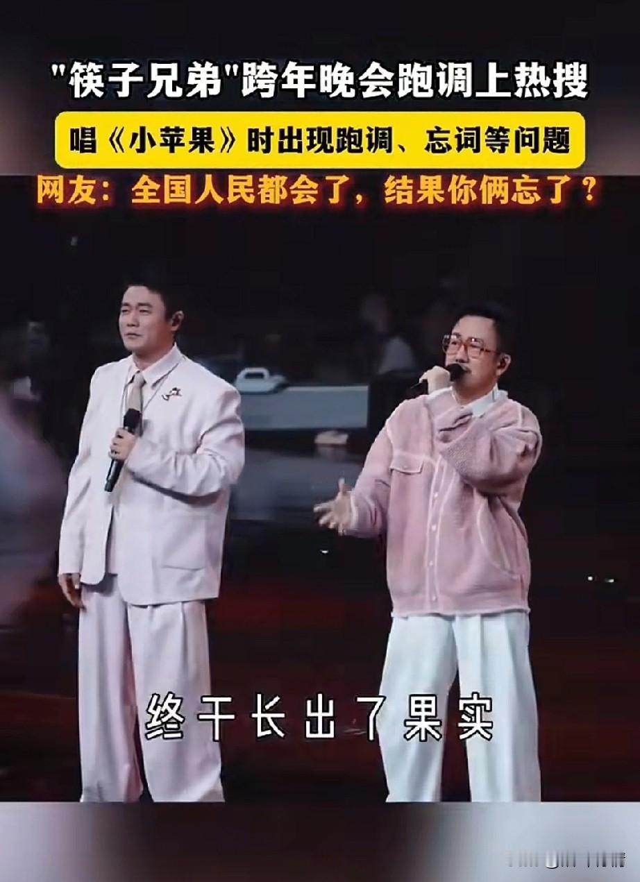 筷子兄弟跨年演唱会上, 因为唱小苹果跑调, 直接火上了热搜, 两个人在舞台上, 看起来有些紧张, 然后开始唱起了小苹果, 如果歌词都唱错了, 不仅跑调,而且歌词都忘了, 王太力更是声音有些颤抖, 应该是很久没有开嗓唱歌, 肖央差点忍不住笑出声来, 硬生生又憋了回去, 两个人相视一眼, 又开始胡唱了, 网友表示我们都会了,你俩全忘了 后来两个人在社交平台上互动, 肖央问王太厉害,王哥苹果可是你写的,第一句就忘词了吗? 王太利表示把所有的不好都忘在2025年吧!两个人的调侃, 瞬间让网友的火气少了不少, 想当年筷子兄弟的小苹果真的爆火全球,算是一首成名曲, 一听起来小苹果的歌曲就想跳舞, 这就是大多人记忆中的小苹果! 大家对于筷子兄弟跨年演唱会上,忘词,跑调这事怎么看? 肖央王太利 筷子兄弟 筷子传奇 大连跨年演唱会