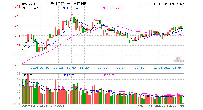 1月5日,半导体ETF(512480)开盘涨1.30%,报1.483元。半导体ETF(512480)重仓股方面,中芯国际开盘涨3.26%,寒武纪涨1.43%,海光信息涨1.38%,北方华创涨1.94%,澜起科技涨1.44%,兆易创新涨3.30%,中微公司涨1.94%,豪威集团涨0.37%,芯原股份涨2.14%,长电科技涨1.14%。
