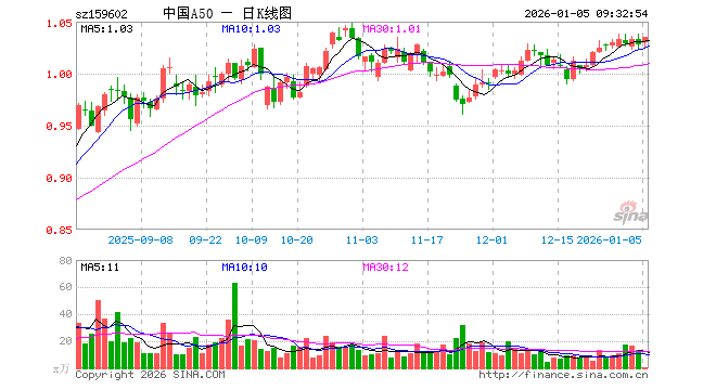 1月5日,中国A50ETF(159602)开盘涨0.19%,报1.030元。中国A50ETF(159602)重仓股方面,宁德时代开盘涨0.75%,紫金矿业涨2.41%,工业富联涨2.00%,贵州茅台涨0.57%,海光信息涨1.38%,寒武纪涨1.43%,比亚迪涨0.70%,恒瑞医药涨0.82%,立讯精密涨0.72%,中际旭创涨1.82%。