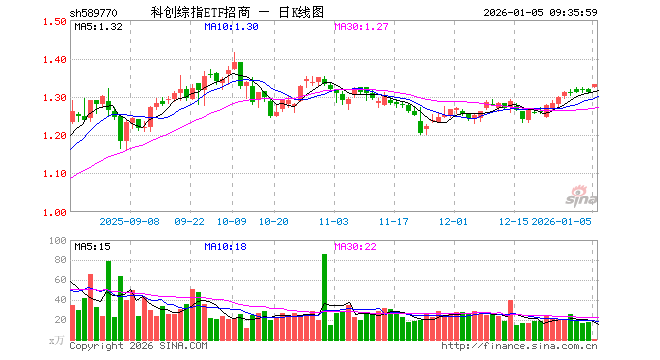 1月5日,科创综指ETF招商(589770)开盘涨0.99%,报1.324元。科创综指ETF招商(589770)重仓股方面,海光信息开盘涨1.38%,寒武纪涨1.43%,中芯国际涨3.26%,中微公司涨1.94%,澜起科技涨1.44%,百利天恒跌2.35%,金山办公涨0.34%,联影医疗涨0.00%,影石创新涨0.04%,传音控股涨0.00%。