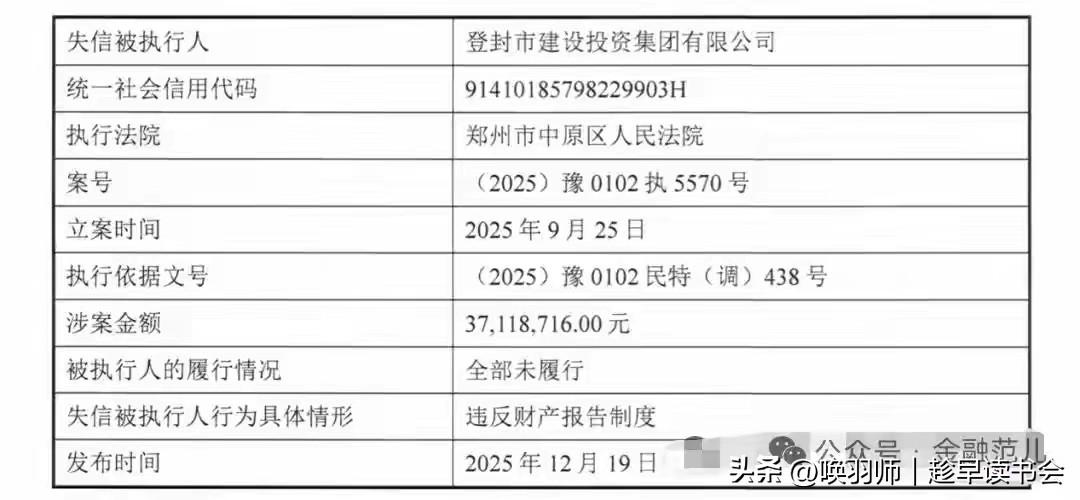 一家总资产超200亿的地方国企,因一笔3711万元的担保贷款逾期,于2025年末被正式列为失信被执行人。这起看似金额不大的违约,却像一根针,刺破了部分地方城投平台在转型深水区的脆弱现状。 表面引爆点:风险传染 本次违约的直接原因是,登封建投为其子公司“登封电厂集团”的银行续贷提供了担保。当被担保方无力偿还,风险便沿着担保链反向传导至母公司。截至2025年6月,该公司类似的无反担保措施对外担保余额高达15.75亿元,其中不少被担保对象自身已深陷债务纠纷,构成了一个潜在的“风险火药桶”。 深层矛盾:流动性枯竭与业务转型困境 这笔违约暴露了更致命的内部危机:严重的流动性枯竭。截至2025年上半年,公司账上可动用的货币资金仅3665万元,但一年内到期的短期债务高达36亿元,资金缺口巨大。同时,其传统的基建代建业务已近尾声,自身“造血”能力弱,营收利润双双下滑,难以覆盖债务本息。其信用评级已被列入观察名单,公开市场融资渠道基本关闭。 民生视角与未来影响: 此事敲响了双重警钟。对地方而言,它警示依赖单一土地财政和盲目担保扩张的模式已难以为继。对普通市民而言,城投平台是城市基础设施和公共服务(如安置房、市政设施)的主要建设者,其信用崩塌可能影响相关项目的持续运营与民生保障。 2026年,总额6万亿元的地方政府置换债券将发行完毕,大规模债务置换进入收官阶段。政策重点正从“应急输血”转向构建长效机制,并着重化解像登封建投这类“经营性债务”风险。这意味着,未来将有更多城投平台必须在“市场化转型”与“被出清”之间做出抉择。对于普通投资者和民众,读懂这类信号,有助于更理性地看待地方经济的基本面与风险。失信债务人 债务逾期 失信 负债失信 青建商票逾期 担保逾期 债务泡沫危机 工程债务 城投债务 城投债务 企业失信 资产烂尾 河南城投债 工程行业债务 企业失信 登封企业