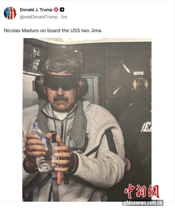 美国总统特朗普当地时间1月3日在社交媒体平台上发布委内瑞拉总统马杜罗在美国军舰上戴手铐、双眼被黑布蒙住的照片,并配文“马杜罗在美国军舰上”。