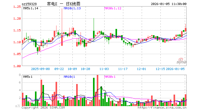 1月5日,截止午间收盘,家电ETF易方达(159328)涨1.31%,报1.158元,成交额338.48万元。家电ETF易方达(159328)重仓股方面,三花智控截止午盘涨3.34%,美的集团涨0.88%,海尔智家涨1.26%,格力电器涨0.70%,石头科技涨1.70%,麦格米特涨0.00%,四川长虹涨1.21%,科沃斯涨2.11%,海信视像涨0.45%,兆驰股份涨0.54%。