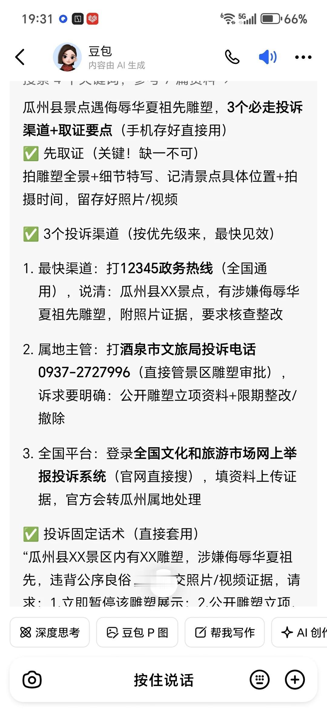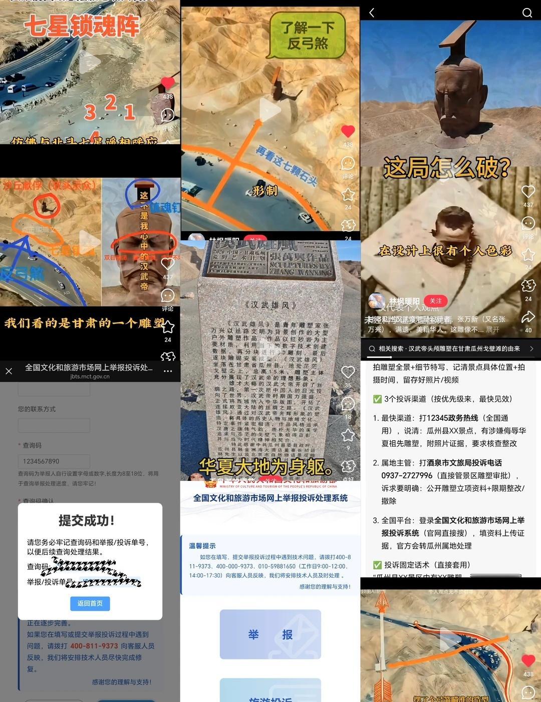举报瓜州《汉武雄风》雕塑 瓜州汉武帝雕塑 举报渠道和话术如下 瓜州县景点遇侮辱华夏祖先雕塑,3个必走投诉渠道+取证要点(手机存好直接用) ✅ 先取证(关键!缺一不可) 拍雕塑全景+细节特写、记清景点具体位置+拍摄时间,留存好照片/视频 ✅ 3个投诉渠道(按优先级来,最快见效) 1. 最快渠道:打12345政务热线(全国通用),说清:瓜州县XX景点,有涉嫌侮辱华夏祖先雕塑,附照片证据,要求核查整改 2. 属地主管:打酒泉市文旅局投诉电话0937-2727996(直接管景区雕塑审批),诉求要明确:公开雕塑立项资料+限期整改/撤除 3. 全国平台:登录全国文化和旅游市场网上举报投诉系统(官网直接搜),填资料上传证据,官方会转瓜州属地处理 ✅ 投诉固定话术(直接套用) “瓜州县XX景区内有XX雕塑,涉嫌侮辱华夏祖先,违背公序良俗,现提交照片/视频证据,请求:1.立即暂停该雕塑展示;2.公开雕塑立项、评审、公示材料;3.组织专家评审后整改或撤除,并书面反馈处理结果。”