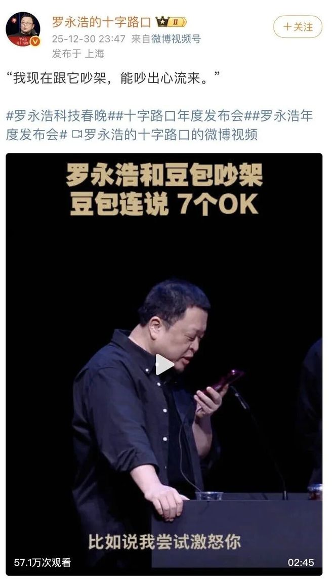 2025年倒数第二天,罗永浩暌违7年的"科技春晚"回归之战充满波折——开场迟到47分钟、视频播错、PPT备注未删净、伴奏突然中断。但这场被网友戏称为"灾难级"的年度科技创新分享大会,却因一场不到5分钟的人机辩论重回正轨。