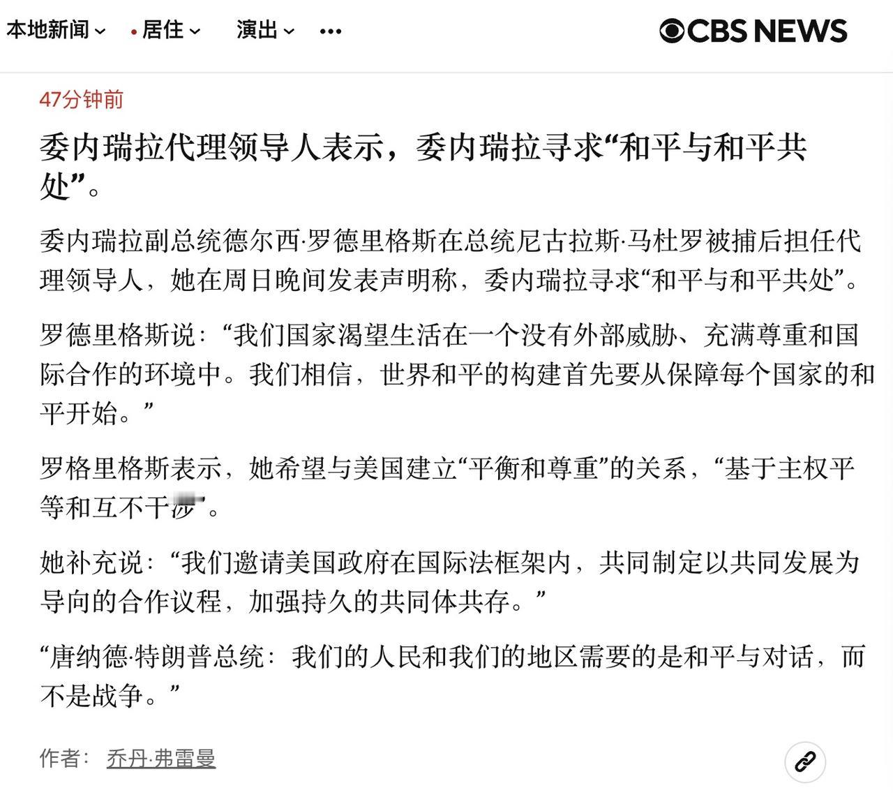 特朗普发出威胁后,委内瑞拉代理总统“下跪”:邀请美国“共同执政”委内瑞拉 在委内瑞拉问题上,美国尽显恶霸、流氓本色,特朗普一点也不装,美国就是为了石油资源。特朗普说:“我们需要获得对委内瑞拉完全的准入。我们需要获得他们国家的石油和其他资源,以便我们重建他们的国家。” 特朗普政府希望在委内瑞拉建立一个顺从的临时政府,优先考虑行政稳定和修复该国的石油基础设施,而不是立即转向民煮。 特朗普还向委内瑞拉代理总统罗德里格斯发出严厉警告:“如果她不做正确的事,她将付出非常沉重的代价,可能比马杜罗的代价还要大。” 罗德里格斯是一名查韦斯主义者,也是马杜罗的亲信副手。她的父亲当年正是在美国CIA支持下被折磨致死,她对美国政府痛恨至极! 然而在马杜罗被捕后的当天晚些时候,罗德里格斯在国防委员会会议上加大了措辞,并谴责了美国的军事行动,并坚称马杜罗仍然掌控着委内瑞拉。 但在特朗普发出通牒的几个小时后,罗德里格斯直接选择了向美国“屈服”。她在发表的声明中说:“我们邀请美国政府在国际法框架内,共同制定以共同发展为导向的合作议程,加强持久的共同体共存。” 这意思说的很清晰明白了。美国将与罗德里格斯政府“共同执政”委内瑞拉,在某种程度上,她将配合美国政府。虽然她在声明中也表达:她希望与美国建立“平衡和尊重”的关系,“基于主权平等和互不干涉”。但显然这是说给委内瑞拉人听的。 罗德里格斯是真屈服还是暗中隐忍?目前不得而知,但将直接影响中方在拉美的利益。特朗普和卢比奥多次说过,美国不希望全世界最大的石油资源落入美国的对手手中。如果美国真能“掌控”委内瑞拉政局,按照美方的强盗尿性,中方在委内瑞拉的利益可能会受损。美国为何总想推翻委内瑞拉政府 美国为何要“接管”委内瑞拉 美国为何要干预委内瑞拉内政