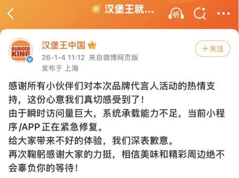 随后,当日午间“汉堡王中国”发文回应:“由于瞬时访问量巨大,系统承载能力不足,当前小程序/APP正在紧急修复。给大家带来不好的体验,我们深表歉意。再次鞠躬感谢大家的力挺,相信美味和精彩周边绝不会辜负你的等待!”