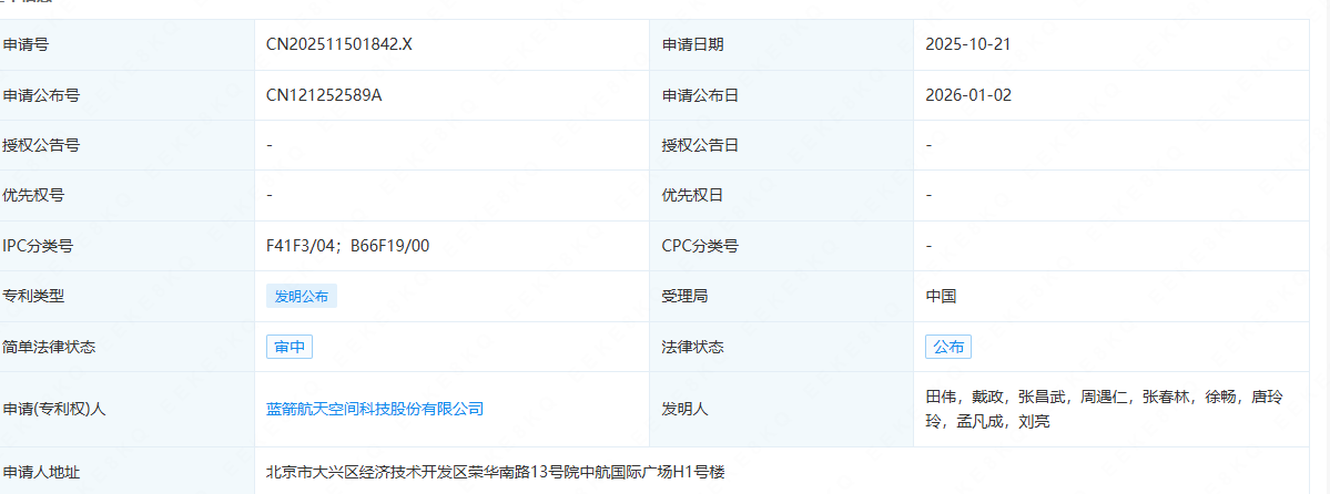 除此项专利外,近期蓝箭航天申请的“轴承试验装置”专利同样得到公布。