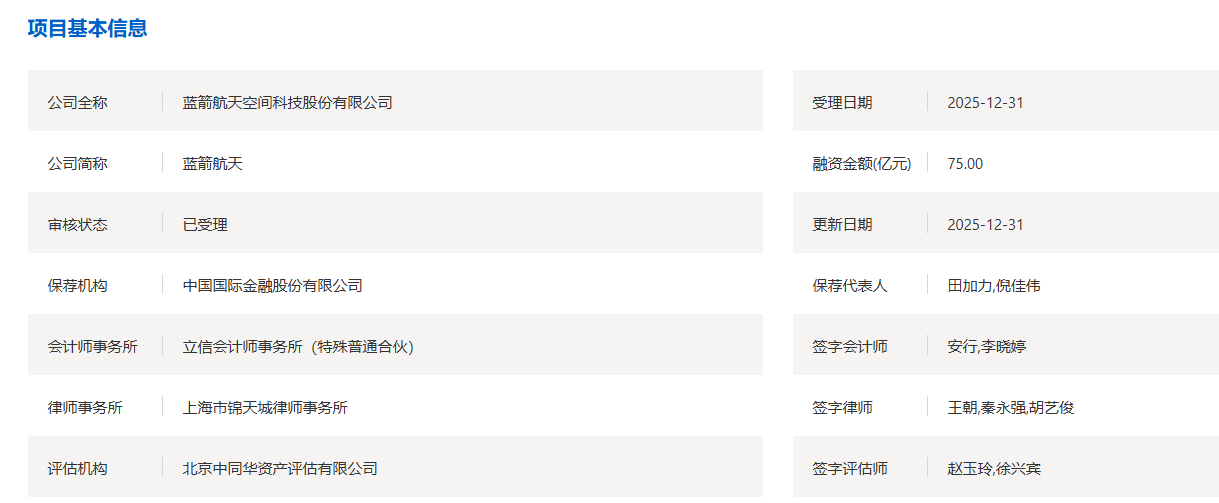 近期,上交所官网显示,蓝箭航天空间科技股份有限公司科创板IPO审核状态变更为“已受理”,公司拟融资金额75亿元。