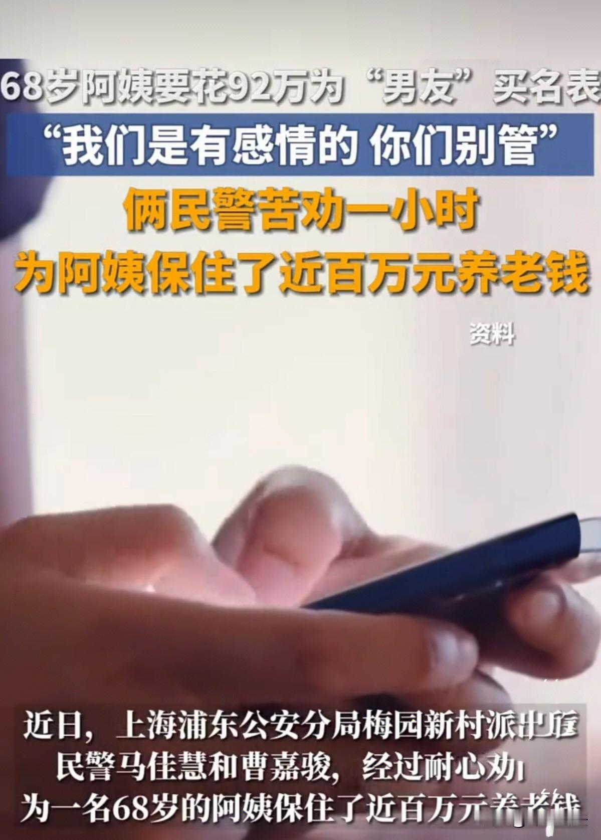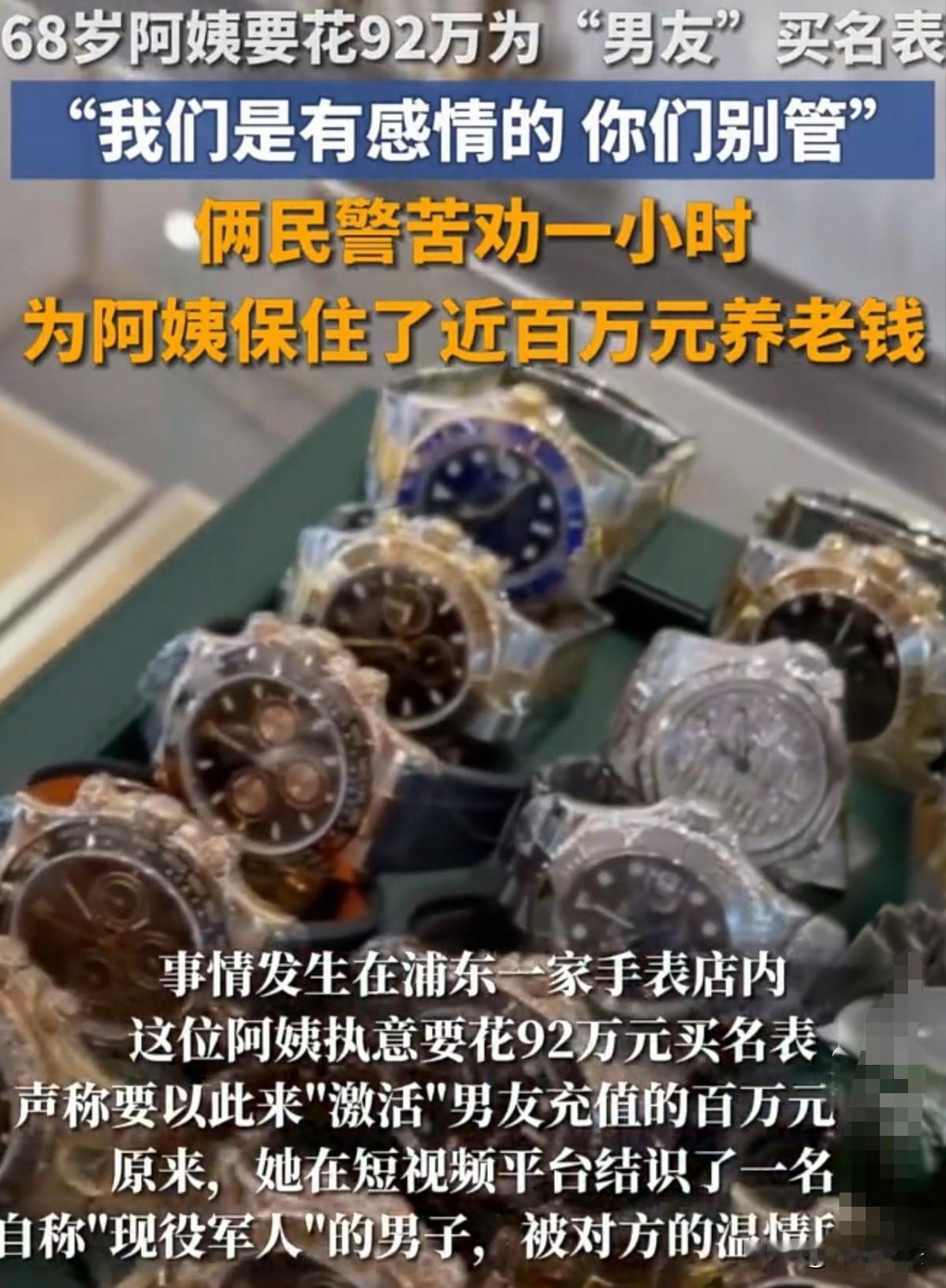 上海浦东,68岁阿姨要花92万元巨资为男友买一块名表,以此来回报男友为她充值的价值百万的虚拟账户,店员发现不对劲报警,阿姨却坚称:我们是有感情的,你们别管。经民警耐心分析劝导后,阿姨幡然醒悟并庆幸:保住了养老钱。 元旦当天,上海浦东的一家手表店内,来了一位大客户。 一位68岁的阿姨,气定神闲的进入店内,扫视片刻后就询问店员价值百万的手表在哪。 店员听后,心中一喜,忙起身为阿姨介绍各种类型的名表。 阿姨一边看,一边询问店员当下时兴的款式,而且要年轻人喜欢的。 店员一听,更是仔细的为阿姨介绍起来,看着阿姨甜蜜的笑意,忍不住开口打趣道:“阿姨这是要给小男生买手表啊。” 阿姨随即笑着表示,这是要给她男友买的,而且表示男友也是个很浪漫的人,他们感情很好。 看着阿姨如此幸福,店员也觉得很难得,可事情随着二人的进一步聊天,店员却觉得事情的走向有点不对劲。 根据阿姨的聊天中,她表示男友是刷短视频认识的,而且是一名现役军人,身份很特殊,平时也很忙碌。 但阿姨也表示,男友虽然忙碌,但总是忙里偷闲对她关怀备至,让她觉得特别温馨。 并且,男友对她出手也很大方,阿姨幸福的表示,男友给她充值了价值100万元的珠宝卡呢。 阿姨忍不住将心中的喜悦分享给旁人,想要让别人也见证她的感情,可店员却有点绷不住了。 店员随即委婉的问起阿姨那这么多钱,能干什么呢,怎么能证明真的是充值了呢。 阿姨随即义正言辞的表示,当然有用了,男友说了,这卡可以买珠宝,什么样式的都有。 就是因为系统原因提现不了,要不可就是实打实的钱了。 而且他们都相处了这么久了,男友怎么会骗自己呢? 听到这,店员明白以一己之力已经说服不了阿姨了,随即打电话寻求民警的帮助。 民警听闻后赶到现场,也询问起阿姨具体情况。 阿姨悠闲的坐在沙发上,神色不满的看向店员,似乎在指责他们多管闲事。 当民警问起男友的事情时,阿姨又是提起二人的甜蜜,民警耐心劝导阿姨,阿姨却表示:“我们是有感情的,你们别管!” 民警哭笑不得,继续深入开导,这才明白,阿姨所谓的男友说自己为其充值价值百万的卡,目前根本无法提现。 并且男友表示,自己为阿姨充了卡,表达了这么大的诚意,但目前自己还缺个手表,希望能得到阿姨同等程度的回报邮寄给自己。 为了提高自己话里的可信度,男友同时提出愿意再补8万元的差价给阿姨当做好处费。 阿姨一听这么好的事情,马不停蹄就来手表店看手表了。 可经验丰富的民警却一下就看出了其中的问题。 但看着阿姨如此坚定的相信爱情,民警并没有气馁,他们依然耐心劝导,一点一点帮阿姨分析其中的问题。 抽丝剥茧,终于,谎言像洋葱般被层层剥开,只剩下欺骗丑恶的嘴脸。 在民警的声声劝慰和悉心关怀下,阿姨也从刚开始的坚定不移到后来的恍然大悟。 在阿姨庆幸保住自己养老钱和对民警及店员的深深感激中,此事也暂时落下帷幕。 根据《刑法》第二百六十六条规定,诈骗公私财物,数额较大的,处三年以下有期徒刑、拘役或者管制,并处或者单处罚金;数额巨大或者有其他严重情节的,处三年以上十年以下有期徒刑,并处罚金;数额特别巨大或者有其他特别严重情节的,处十年以上有期徒刑或者无期徒刑,并处罚金或者没收财产。本法另有规定的,依照规定。 在本案中,骗子假借和阿姨谈恋爱,实际是奔着她的钱去的。 骗子虚构、伪造充值百万元珠宝卡的事实,隐瞒其本质上的欺骗行为,使得阿姨陷入了错误的认知,意图来骗取阿姨同等程度的价值百万元的手表,已经涉嫌构成诈骗罪。 而且手表价值92万元,数额特别巨大,如果骗子落网,等待他的将是十年以上有期徒刑或者无期徒刑,并处罚金或者没收财产。 值得庆幸的是,阿姨在民警的劝说下,并未将手表寄走,未造成事实上的财产损失。 因此,骗子属于犯罪未遂,在判刑时,可酌情从轻处罚或者减轻处罚。 同时,根据《刑法》第372条,冒充现役军人身份实施诈骗,损害军队声誉和公共利益,依法应处三年以下有期徒刑、拘役或管制;情节严重(如多次行骗、造成重大损失)可处三年以上十年以下有期徒刑。 骗子谎称现役军人,意图骗取阿姨价值近百万元的手表,已经触犯该条法律,依法应该判处三年以下有期徒刑、拘役或者管制。 当然,具体量刑,会根据其诈骗金额以及引发的后果等等情况综合考虑,最终做出裁定。 (以上报道来源于红星新闻。)