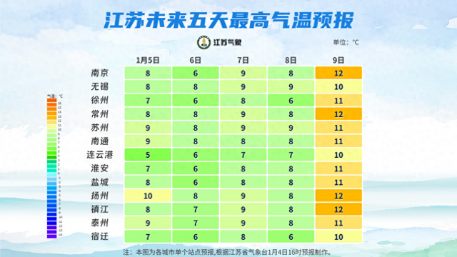 未来10天冷空气活动较为频繁,全省平均温度接近常年同期。前期气温有所回升,6日前后有一次弱冷空气影响江苏,12日前后还有一次强冷空气过程。