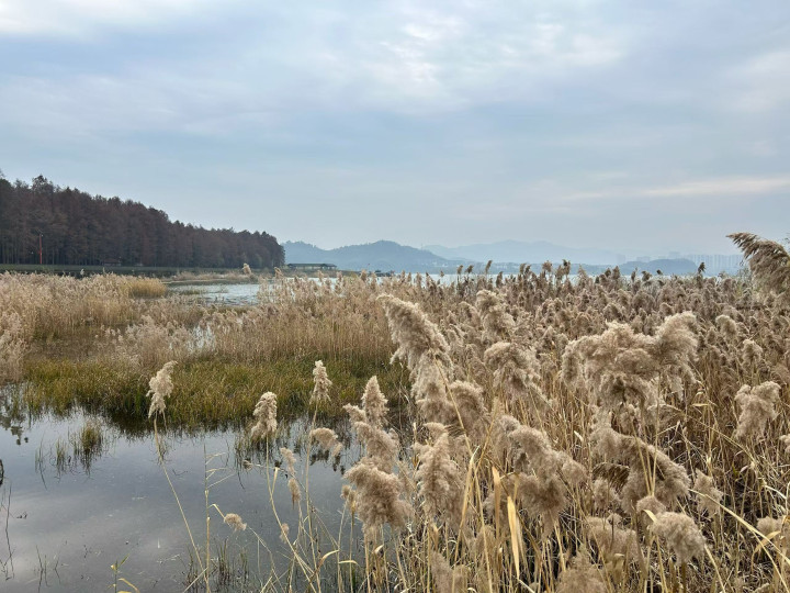 @千里骏马:小寒,青山湖畔,有摇曳的芦苇,还有绿意十足的湖景色!