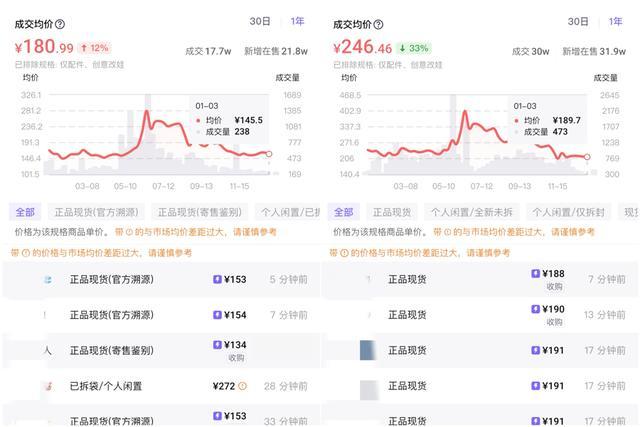 “本我”在某二手平台的成交价格变化,左图为近1年,右图为近30天