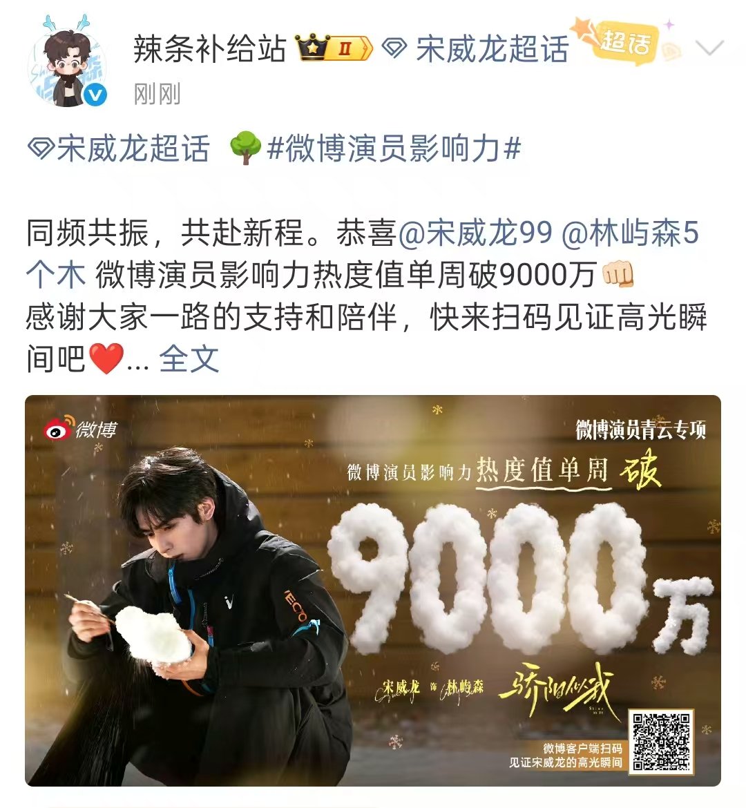 宋威龙微博演员热度值单周破9000万 破9000万的单周热度,是观众对演员宋威龙的热情回应。他将林屿森从封闭自我到拥抱情感的复杂心路,诠释得层次分明,富有说服力。期待他未来解锁更多像这样深入人心的角色。