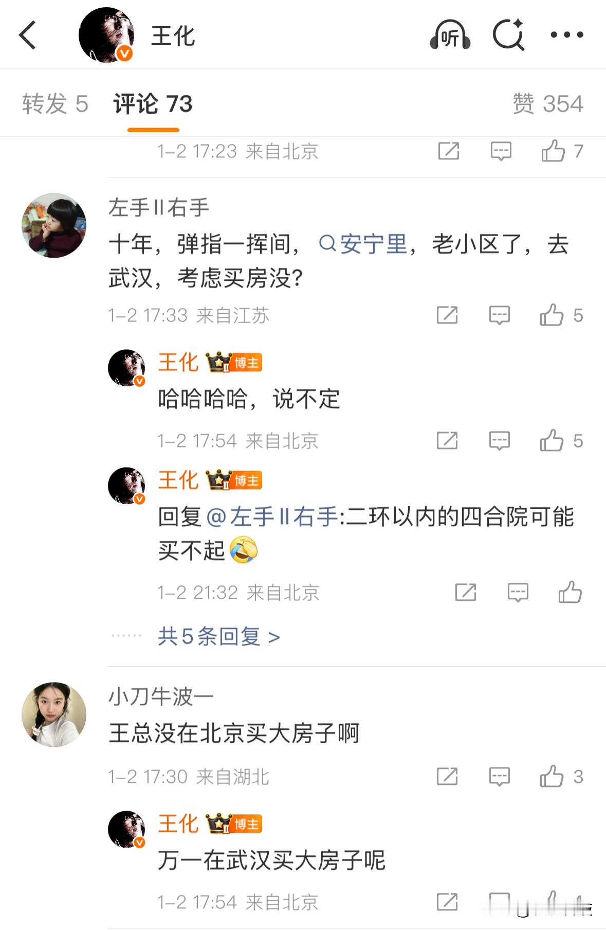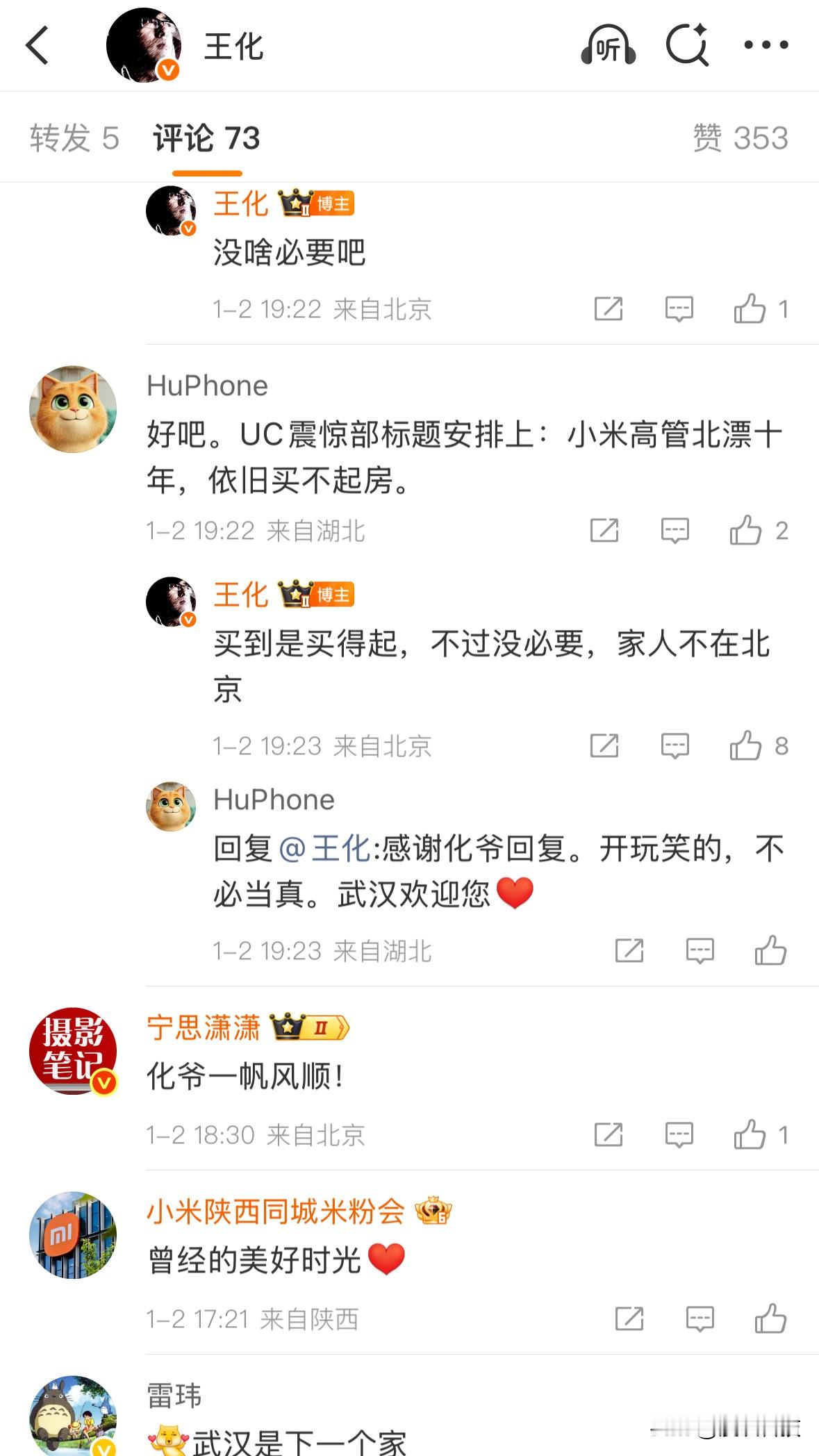 小米高管王化在北京工作十年多一直租房住,回应网友:买倒是买得起,不过没必要,家人不在北京。万一在武汉买大房子呢?