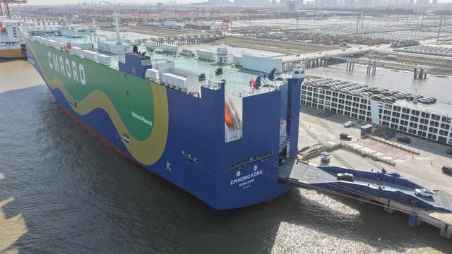 2025年12月9日,在江苏省苏州港太仓港区,“港荣”号甲醇双燃料动力滚装船在装载出口汽车(无人机照片)。新华社发(计海新摄)