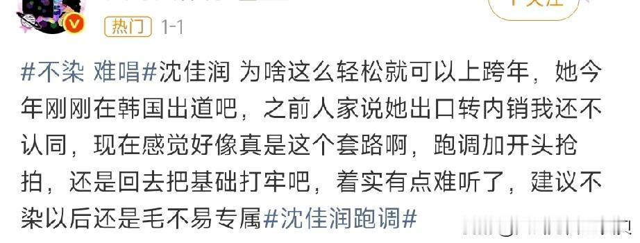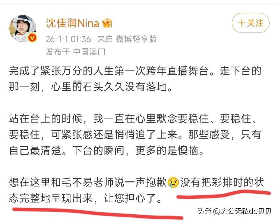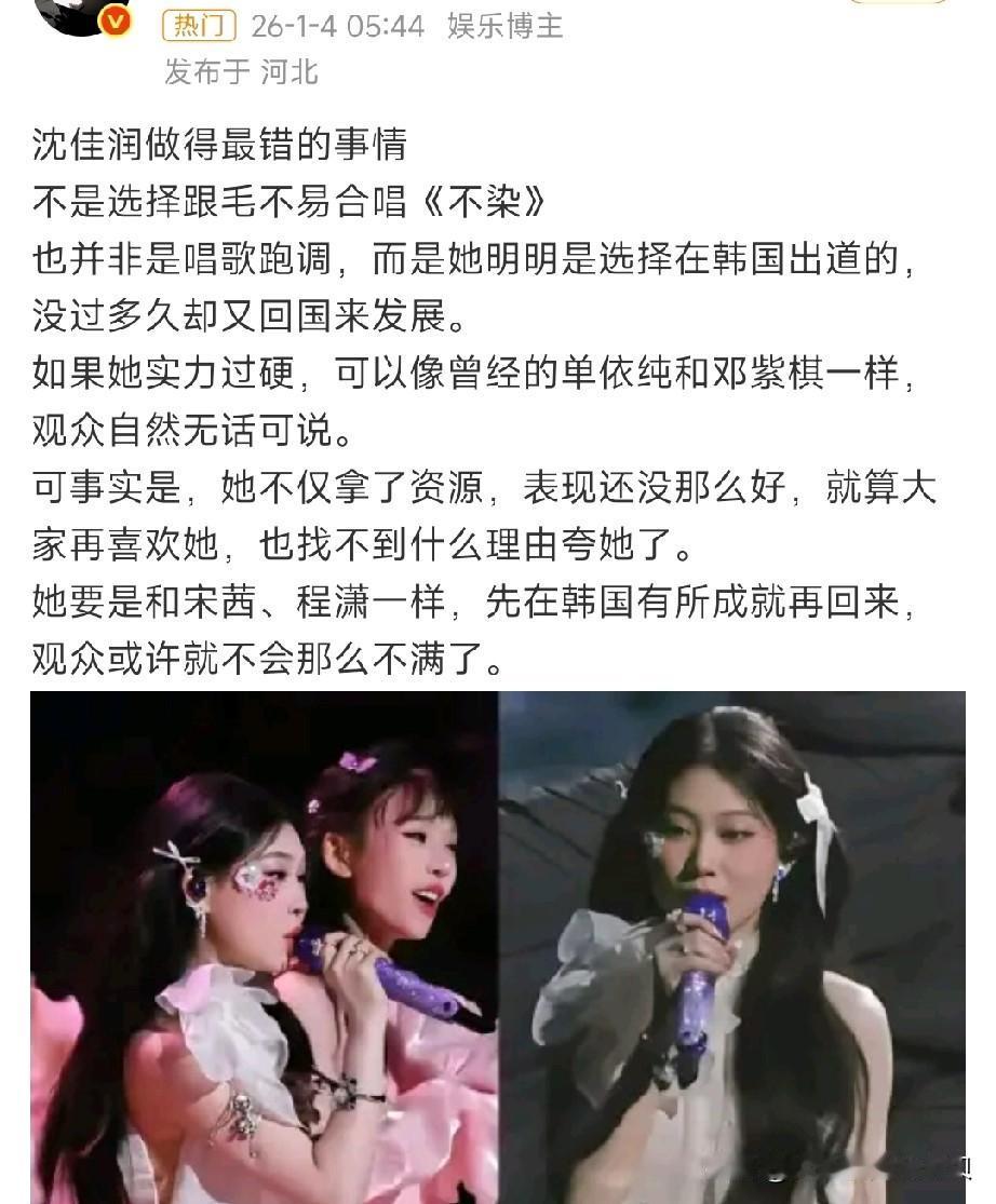 记得沈佳润去年出道时,粉丝空瓶文案是, 「人家🇰🇷出道,也不占用内娱资源,虽然长得一般,但是很努力啊!」 然而出道至今,没见她参加过韩国一个节目,倒是内娱的各大重量级晚会,已经快上个遍了。 唱歌跑调翻车后,写了一篇道歉文,不是给观众的,是给毛不易的, 也不是道歉自己唱的不好,拖累了毛不易,而是强调自己「因为太紧张,没发挥好」 除了晚会,商务也开始全面接洽,知名饮料品牌的推广已经拿下。 这跟当初营销的不占用内娱资源,好像不太一样啊。