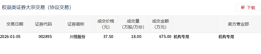 川恒股份今日大宗交易平价成交18万股,成交额675万元