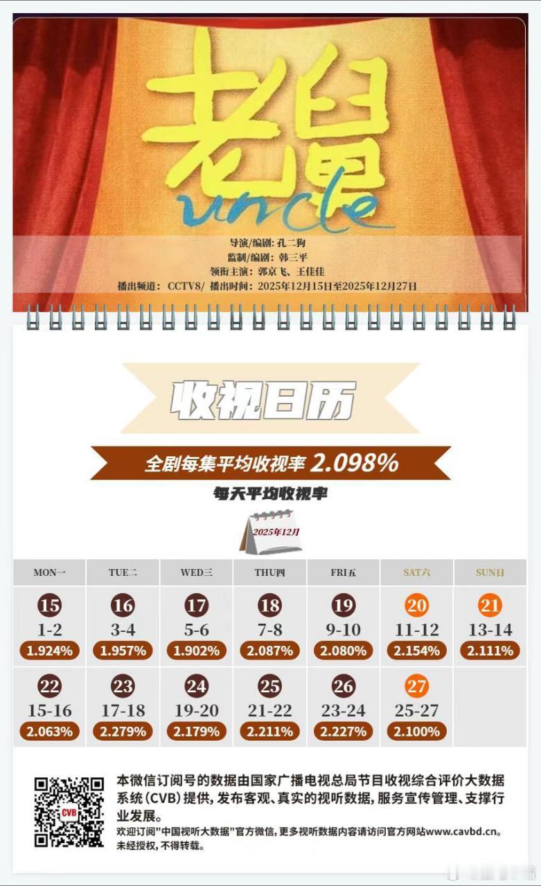 cvb收视日历!《狙击蝴蝶》 0.381 我估算0.382《黑白局》 0.185 我估算0.185《长安二十四计》1.130 我估算1.127《老舅》 2.098《新一年又一年》0.345