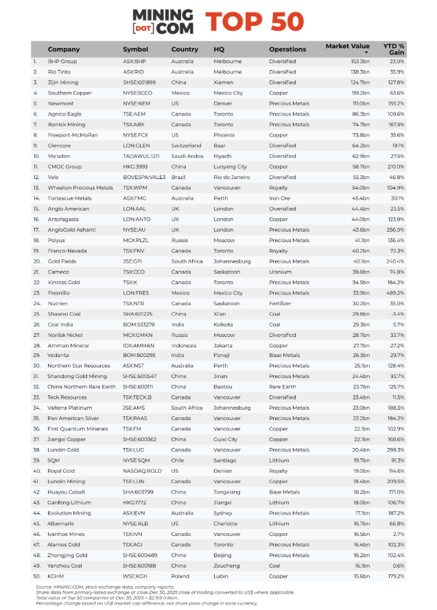 中国冠军企业紫金矿业以1240亿美元的市值位列第三,2025年市值飙升127.8%。此外,上榜的中国企业还有洛阳钼业(3993.HK)(第11名)、陕西煤业(601225.SH)(第25名)、山东黄金(600547.SH)(31名)、北方稀土(600111.SH)(第32名)、江西铜业(600362.SH)(第37名)、华友钴业(603799.SH)(第42名)、赣锋锂业(1772.HK)(第43名)、中金黄金(600489.SH)(第48名)、兖矿能源(600188.SH)(第49名)。
