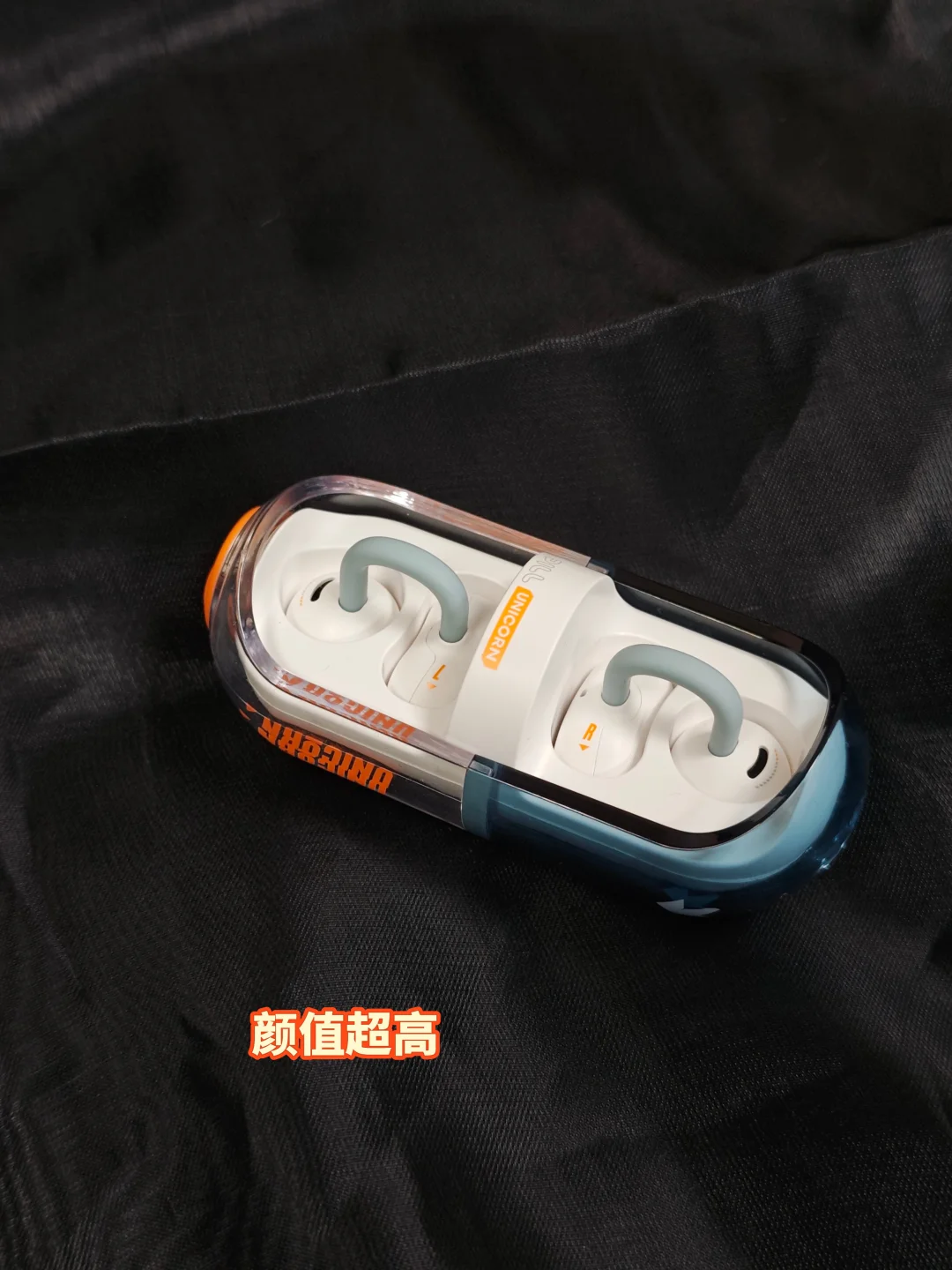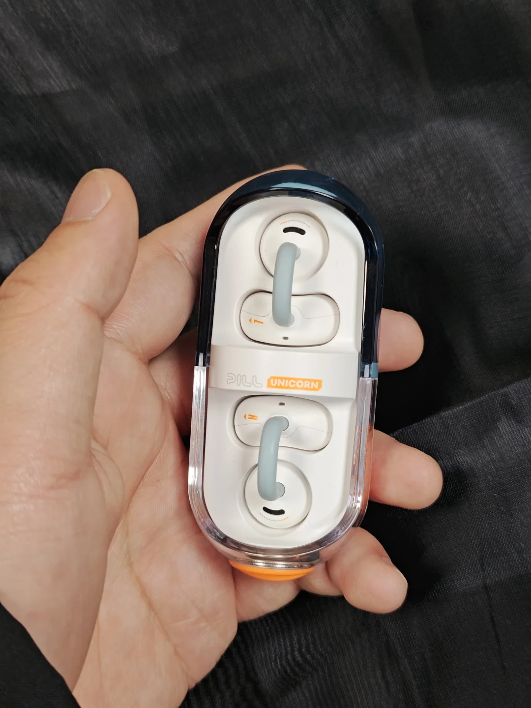 这款耳机最大的卖点其实是设计,胶囊造型的充电盒确实很吸睛,半透明外壳加上蓝白/橙色的撞色设计,视觉层次感很强。还有旋转开盖的阻尼感做得不错,把玩起来确实有点解压。耳机本体是C型桥设计,液态硅胶材质触感很软,亲肤感很好。