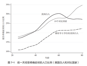 通常情况下,疼痛总是随年龄增长而稳步上升。然而美国白人报告的慢性疼痛水平,呈现出一种全球独有的怪异模式:在中年时期达到峰值,甚至超过了更年长的老年人群体。而没有大学学位者,在任何年龄段报告的疼痛水平,都远高于有学位的同胞。疼痛,成了他们生活困境最直接的生理表达。