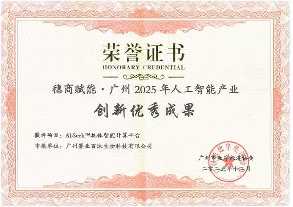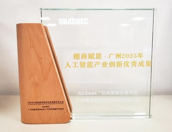 2025年12月26日,2025大湾区数字经济与区块链生态大会在广州圆满落幕。本次大会以“数智融通,链启生态”为核心主题,汇聚政、产、学、研、用、金、服各界精英,共探区块链与人工智能技术融合发展新路径,并重磅发布多项年度创新成果榜单。广州赛业百沐生物科技有限公司(简称“赛业百沐”)凭借在“人工智能+生物制造”领域的突出表现,一举斩获两项殊荣——成功入选“2025大湾区数链生态大会数字先锋企业”,自主研发的「AbSeek®智能抗体计算平台」被认定为“穗商赋能・广州2025年人工智能产业创新优秀成果”,彰显了业界对其技术创新实力与行业引领价值的高度认可。