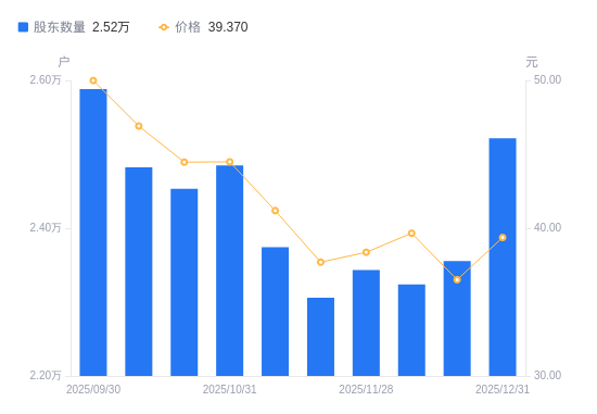 日期A股户数(户)流通A股户均持股数(股)户均持股市值(万元)2025-12-31252169092.2235.802025-12-19235569732.9535.532025-12-10232399865.7139.132025-11-28234359783.2037.542025-11-20230609942.3037.482025-11-10237419657.1039.782025-10-31248509226.1341.052025-10-20245349344.9641.562025-10-10248229236.5443.332025-09-30258818858.6044.28
