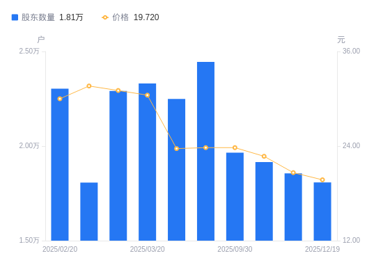 日期A股户数(户)流通A股户均持股数(股)户均持股市值(万元)2025-12-19180776099.2712.032025-12-10185545942.4712.262025-10-31191585755.1213.062025-09-30196495611.3113.352025-06-30244524509.1010.732025-03-31224874903.2011.612025-03-20233074730.5414.412025-03-10229144811.6714.942025-02-28180666102.8819.302025-02-20230324787.0214.36