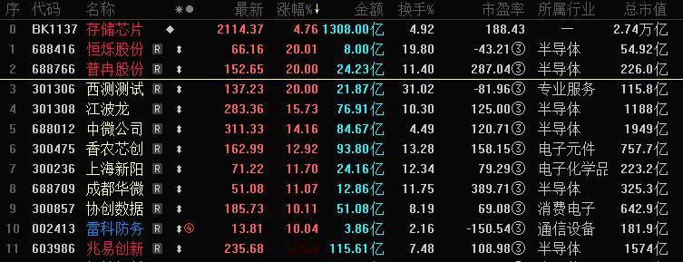 2026存储涨价第一枪!三星、海力士DRAM报价又涨70%。 今天半导体板块大涨4.18%全A第五,主力净买入54.5亿第一,半导体板块中的主题,存储芯片大涨4.76%,主力净买入39.2亿,居前。 半导体板块作为科创板第一权重,大涨带动科创板大涨4.40%,宽基涨幅第一。 存储芯片今天11家涨停,涨超10%,容量涨停是兆易创新,成交115亿。