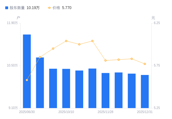 近一年(2024年12月31日至2025年12月31日),中粮科技A股股东户数从11.78万户,减低至10.19万户,降幅13.48%,区间股价上涨1.58%。