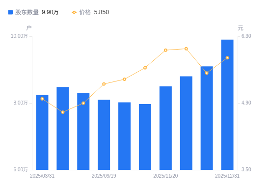 日期A股户数(户)流通A股户均持股数(股)户均持股市值(万元)2025-12-319900043226.5425.292025-12-199100047026.6826.012025-12-108800048629.8629.372025-11-208500050346.2130.262025-10-317970053694.2030.282025-09-308021853347.4828.812025-09-198100052832.4428.002025-07-108300051559.3725.262025-06-308481450456.6223.762025-03-318244551906.4625.90