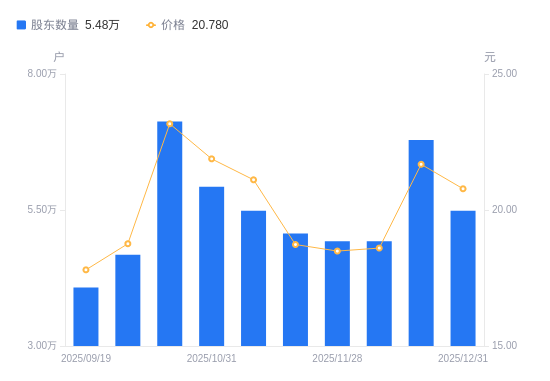 日期A股户数(户)流通A股户均持股数(股)户均持股市值(万元)2025-12-31548435075.2010.552025-12-19678854100.168.892025-12-10492715649.1510.512025-11-28492755648.6910.442025-11-20506595494.3710.292025-11-10548515074.4610.712025-10-31592604696.9210.282025-10-10712703905.429.052025-09-30467865949.2011.162025-09-19407757097.8012.63
