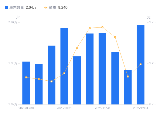 日期A股户数(户)流通A股户均持股数(股)户均持股市值(万元)2025-12-312035713330.6612.322025-12-191969913775.9412.522025-12-101996513592.4013.012025-11-282024613403.7512.992025-11-202023713409.7112.982025-11-101990513633.3712.872025-10-312032013354.9312.192025-10-202005913528.7012.222025-10-101978813713.9812.422025-09-301982713687.0012.43