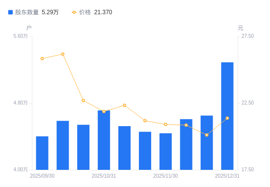 日期A股户数(户)流通A股户均持股数(股)户均持股市值(万元)2025-12-315287815524.0833.172025-12-194649317656.0435.512025-12-104606817818.9237.152025-11-304438818493.3438.652025-11-204455618423.6139.022025-11-104523718146.2640.522025-10-314711817421.8438.102025-10-204539118084.6941.032025-10-104586517897.7946.842025-09-304401018652.1748.18