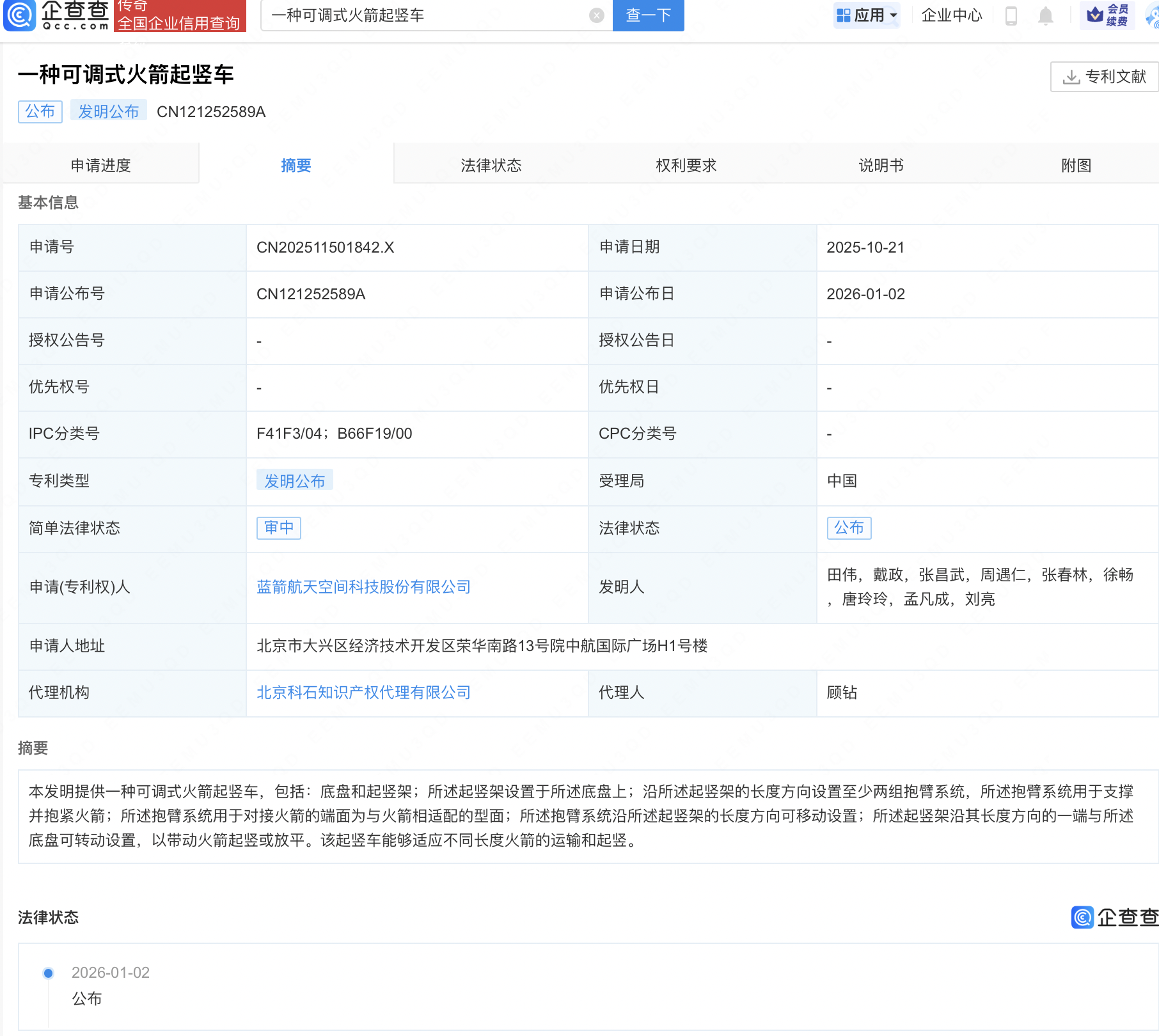 企查查APP显示,近日,蓝箭航天空间科技股份有限公司“一种可调式火箭起竖车”专利公布。企查查专利摘要显示,本发明包括:底盘和起竖架;所述起竖架设置于所述底盘上;沿所述起竖架的长度方向设置至少两组抱臂系统,所述抱臂系统用于支撑并抱紧火箭;所述抱臂系统用于对接火箭的端面为与火箭相适配的型面;所述抱臂系统沿所述起竖架的长度方向可移动设置;所述起竖架沿其长度方向的一端与所述底盘可转动设置,以带动火箭起竖或放平。该起竖车能够适应不同长度火箭的运输和起竖。