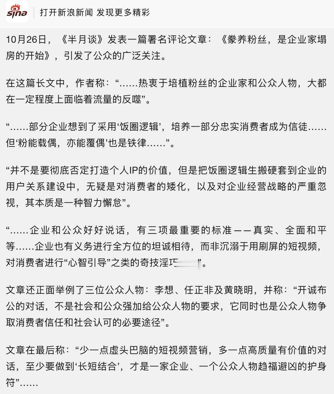 等等,理一下逻辑啊,某品牌下半年遭遇重大舆情是什么时候?1、是不是跟半月谈这篇文章发布的时间有比较高的重合度?2、然后相当于被不指明的被点名之后,今天还发生这么一出,那是不是说明对于家长的意思领会的不到位又或者过于自信了(图2、3)?3、然后有粉丝清醒了(如图4)?4、其实对于舆论的治理,在今年上半年其实就已经有征兆了,还记得乒协主席换届吗,自此之后是不是与乒乓球相关的饭圈活动立马熄火了?要是这个逻辑成立的话,即便是在帝都,有些人的觉悟也一样是有局限的啊。还是之前那句话,出来混,迟早要还的。