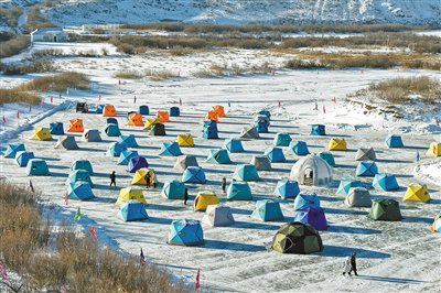 在位于额尔古纳市的黑山头口岸景区,60余顶暖帐错落排布在中俄界河上,额尔古纳冰雪欢乐季第三届中俄界河冰钓活动让冰钓爱好者们沉浸式体验“凿冰寻鱼”的乐趣。该活动已转入常态化运营,正在成为集冰雪竞技、生态观光、人文体验于一体的额尔古纳冬季旅游新IP。