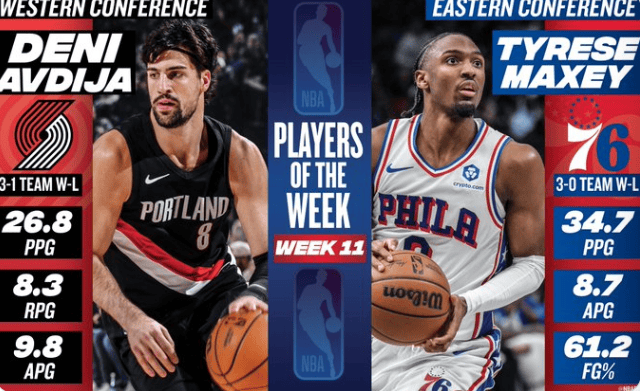 虎扑01月06日讯NBA更新官方社媒公布马克西、阿夫迪亚当选上周NBA最佳球员。