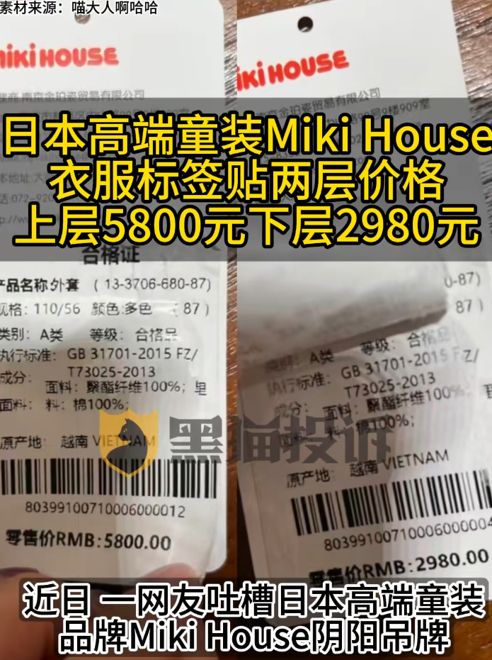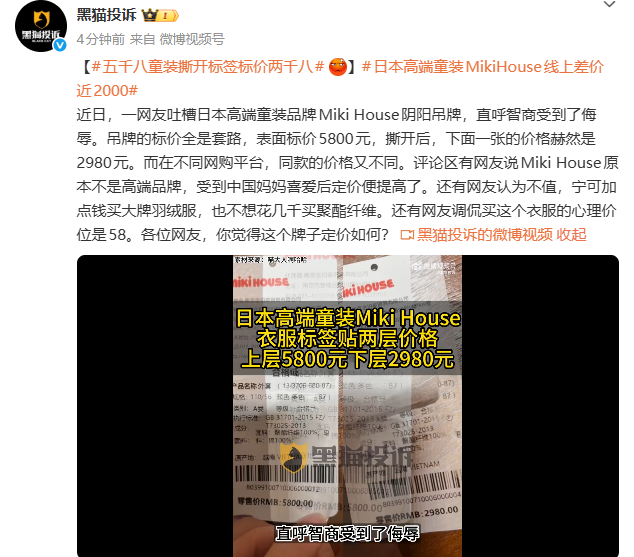 2025年11月26日消息,据黑猫投诉报道,有消费者反映,在选购日本著名童装品牌MIKI HOUSE的衣服时,发现衣服的吊牌标签有两层,上层售价为5800元,撕开后下层售价只有2980元,差价近3000元。网友直呼,“阴阳吊牌”简直侮辱智商。