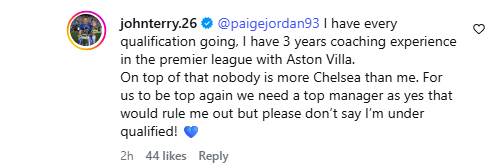 不过,特里本人则现身评论区,对质疑者予以了回击。特里对其中一位质疑者表示:“我拥有执教所需的所有资质,除此之外,世上再无任何人比我更懂切尔西。”