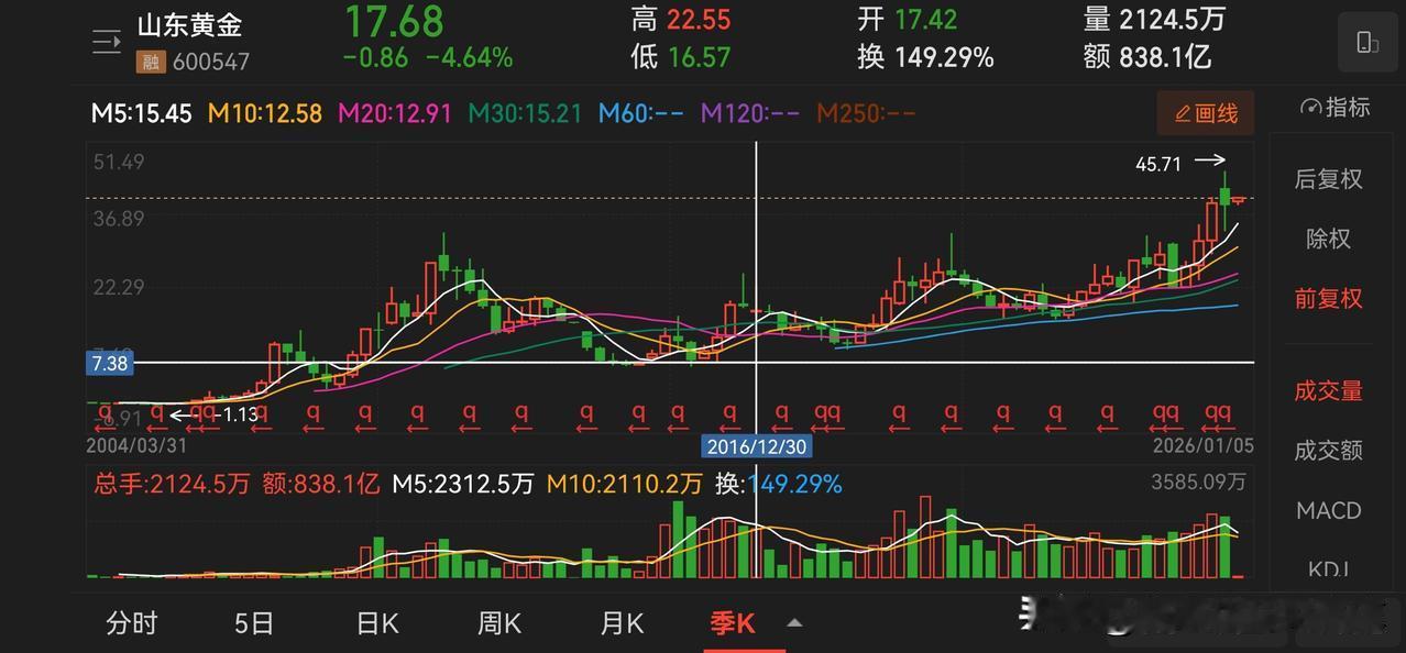 昨天晚上去理发,已经认识了几年的 tony 老师忽然提到白银,说有大姐建议,黄金已经很贵了,可以考虑投资白银。每克已经从四块多涨到了二十云云。 传奇基金经理彼得林奇之前好像提到了一个危险信号,当鞋童和理发师开始讨论股票的时候,就需要考虑离场了。 这一次,会不会在白银上应验呢?让我们拭目以待。 山东黄金在这么一大波黄金行情的加持下都没能发动连续性行情。这一点还不如北方稀土,两个月突突了两倍,然后就休息,效率极高,当然,参与的难度也更大一些。
