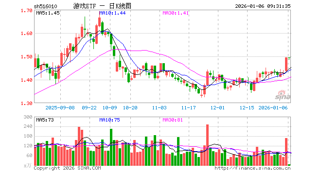 1月6日,游戏ETF(516010)开盘涨0.00%,报1.494元。游戏ETF(516010)重仓股方面,巨人网络开盘跌0.40%,恺英网络涨0.69%,三七互娱涨0.89%,光线传媒涨0.06%,神州泰岳跌0.51%,完美世界跌0.95%,吉比特涨0.25%,掌趣科技跌0.19%,顺网科技跌0.14%,游族网络跌0.32%。