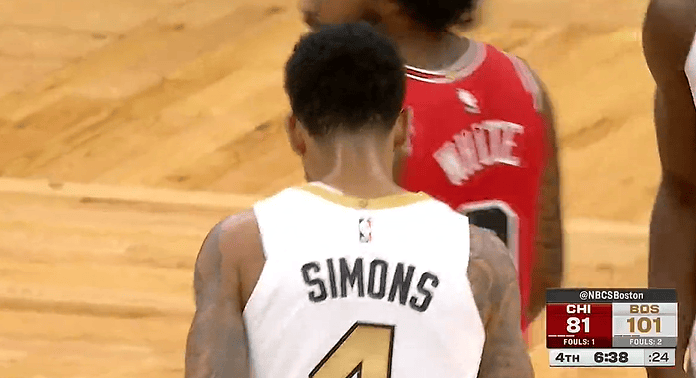 比赛第四节,小西蒙斯外线三分再中,目前三分13中7砍下全队最高的24分。
