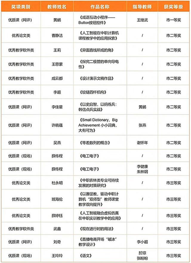 近日,2025年安徽省及滁州市中等职业学校优秀论文、优秀教学软件和优质课(简称“三优”)评选结果先后公布。滁州市应用技术学校教师凭借深厚的教学积淀、创新的实践探索和过硬的专业能力,在省、市两级评选中捷报频传。