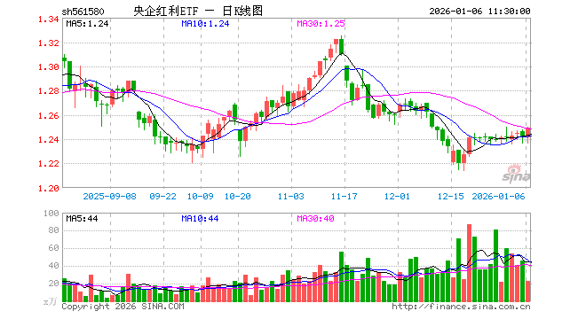 1月6日,截止午间收盘,央企红利ETF(561580)涨0.64%,报1.249元,成交额2820.01万元。央企红利ETF(561580)重仓股方面,中远海控截止午盘涨0.13%,农业银行跌0.13%,南钢股份涨1.53%,中信银行跌1.85%,建设银行跌0.97%,中材科技跌3.16%,鲁西化工涨8.11%,中粮糖业跌0.06%,大秦铁路涨0.19%,中国神华涨1.22%。