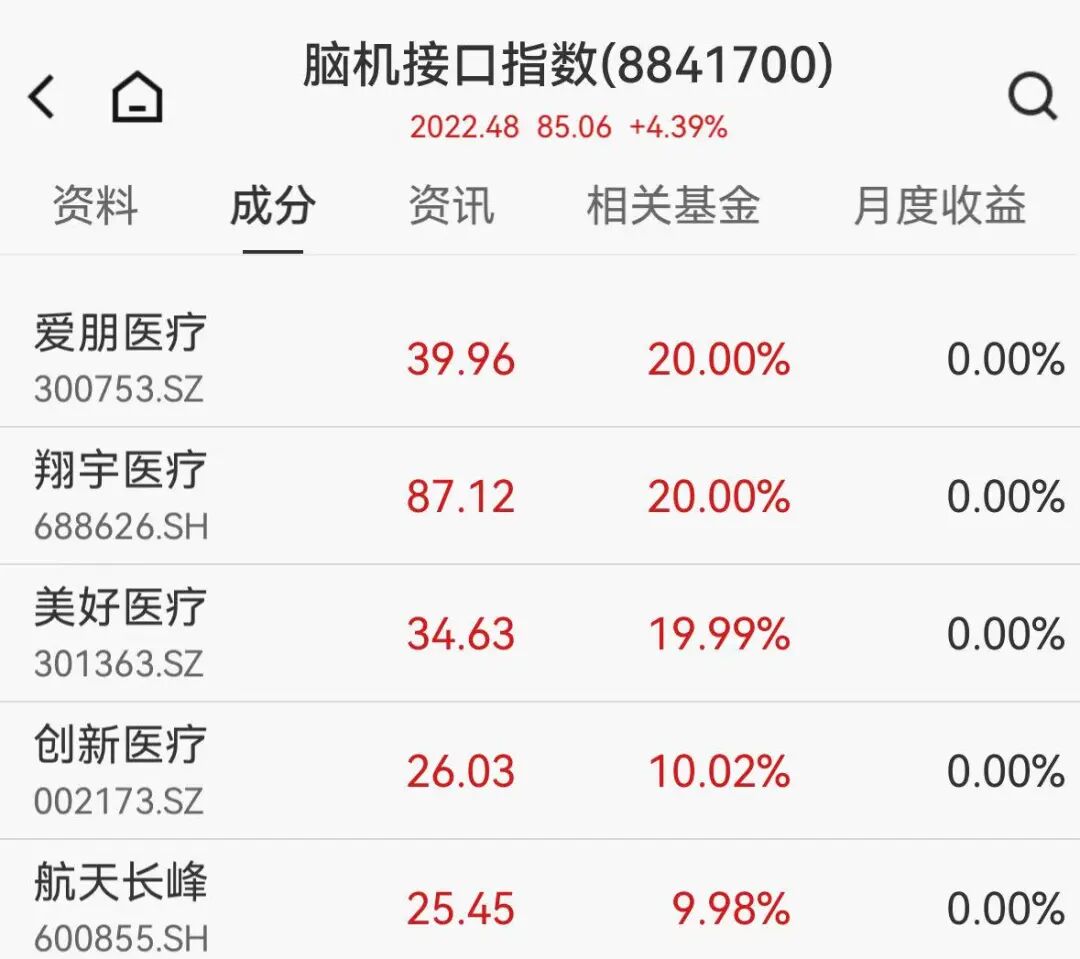 从板块来看,脑机接口概念延续强势,十余只成分股涨停,三博脑科、美好医疗、创新医疗2连板。