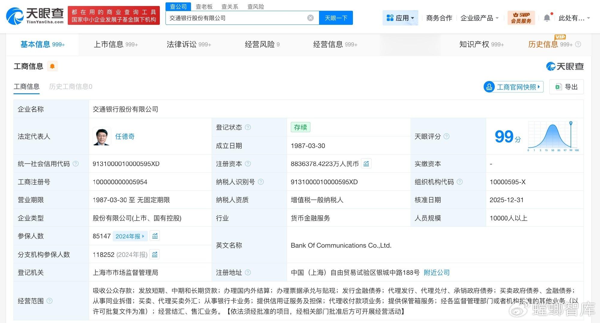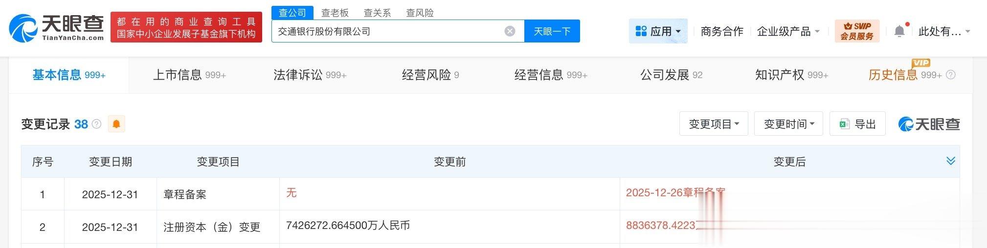 天眼查工商信息显示,近日,交通银行(601328)发生工商变更,注册资本由约742.6亿人民币增至约883.6亿人民币,增幅约19%。